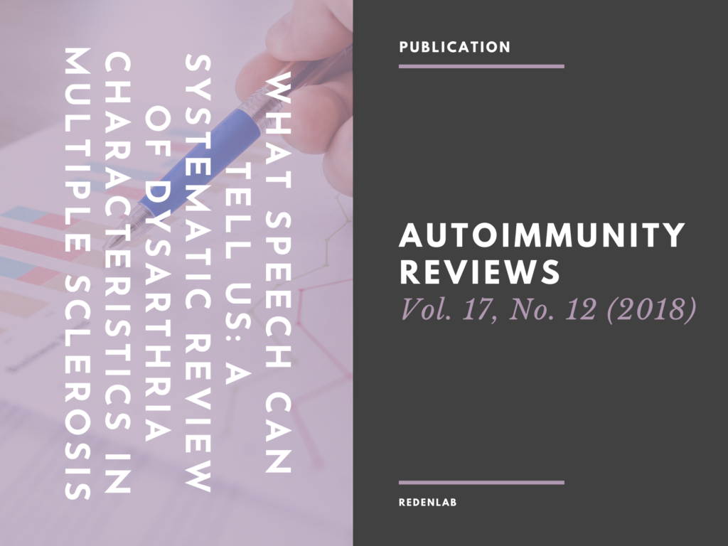 Four domains of speech have been identified: articulation (slow articulation and imprecise consonants), voice (pitch and loudness instability), respiration (decreased phonatory time and expiratory pressure) and prosody (longer and frequent pauses, deficient loudness control). Studies also explored I) predictive models for diagnosis of MS and of ataxia using speech variables, II) the relationship of dysarthria with cognition and III) very few studies correlated neuroimaging with dysarthria. We could not identify longitudinal studies of speech or dysarthria in Multiple Sclerosis.
